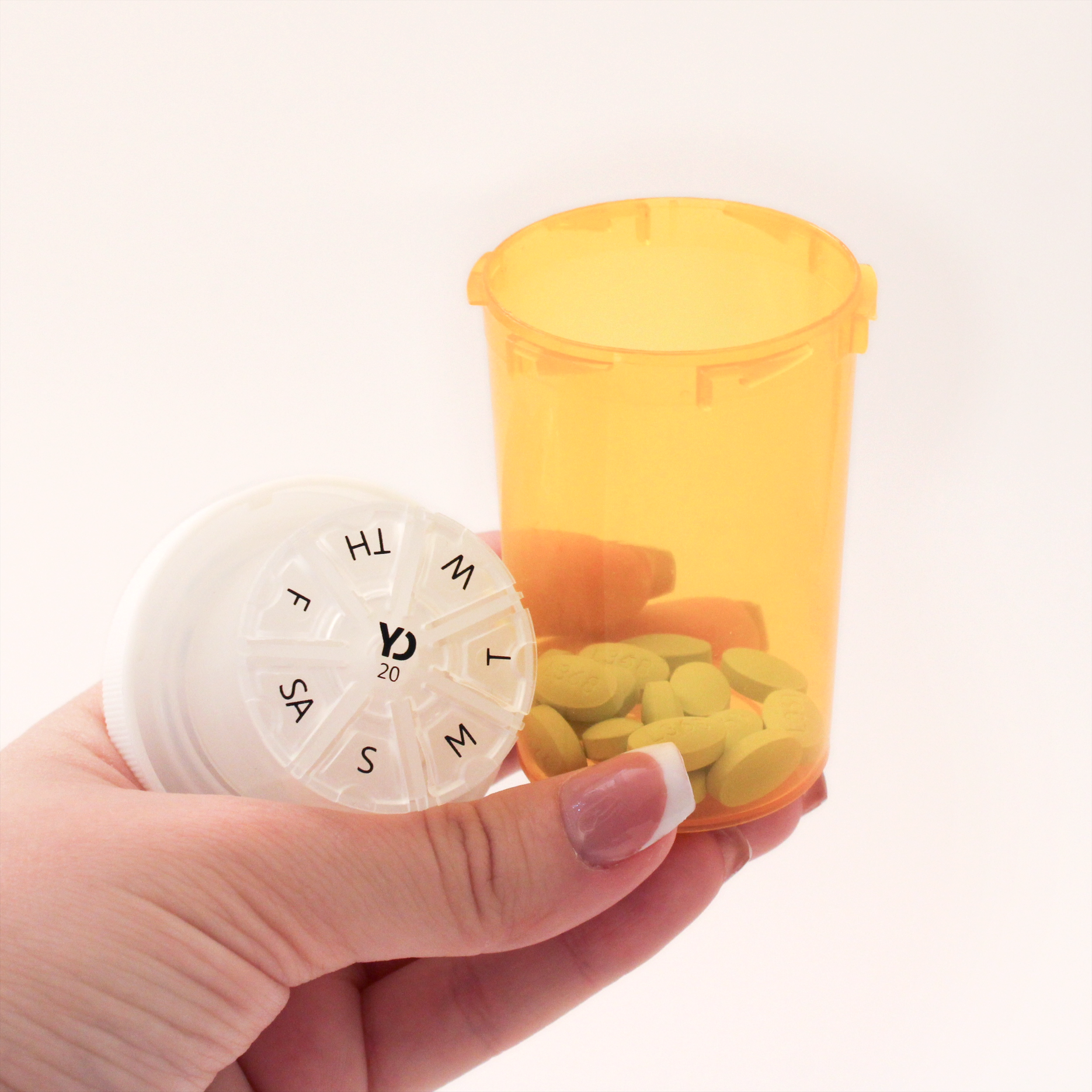 **The Under Cap fits in ‘most’ prescription bottles. Please look at the inside of your existing prescription cap. You’ll most likely see a reference to the DRAM size; my bottle from CVS says 20d on the inside; this matches our 20 Small sizes.